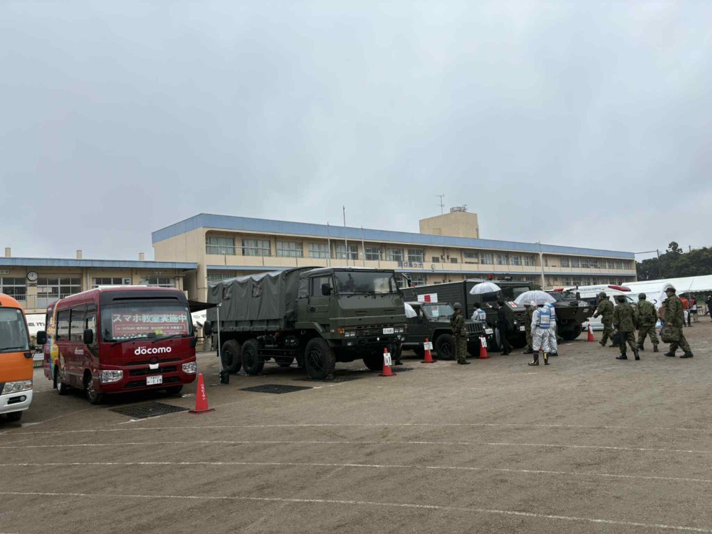 自衛隊の車両展示を見学したり、避難所の様子を外から覗いたり、火災時の煙体験にも参加。