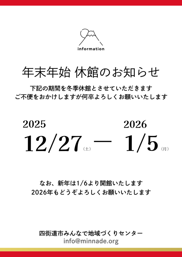 センターでは、年末年始、通常の休館と合わせ、12月27日(土)~1月5日(月)までお休みとなります。